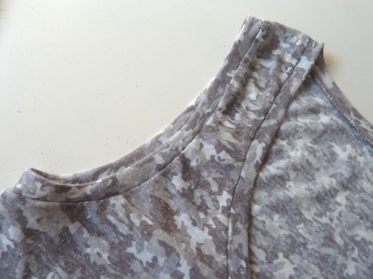 J’ai fait comme ma première version : j’ai tout simplement échancrer les emmanchures de 2 cm et j’ai choisi la taille 34 (alors que je corresponds à la taille 36 dans le tableau des mesures) pour avoir un t-shirt plus ajusté, plus moulant.