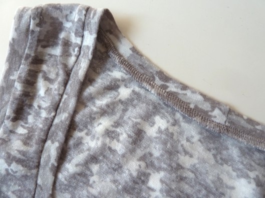 Côté finitions : une bande rapportée pour l’encolure. Idem pour les emmanchures. Le tout intégralement cousu à la surjeteuse.