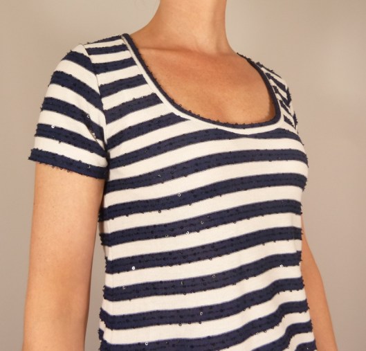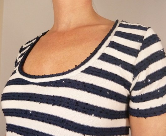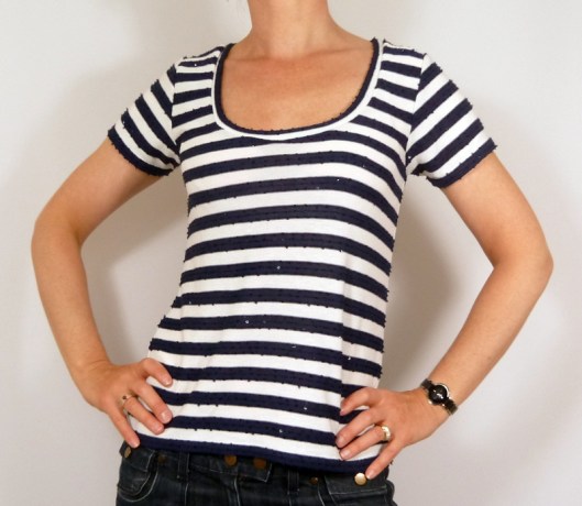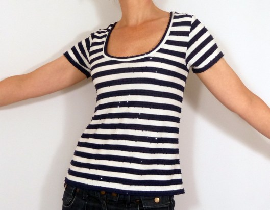Question tissu, j’ai choisi un jersey style marinière avec de jolis sequins. Il s’agit ici de chutes de tissus haute couture qu’on m’a donné (copine/couturière qui a travaillé dans quelques-unes des plus belles maisons de couture parisiennes) :
