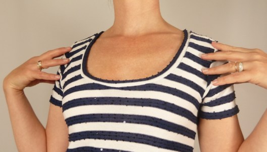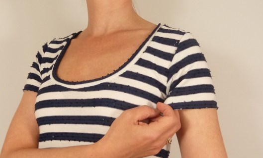 Pour le bas de mon t-shirt, j’ai décidé de suivre les rayures et non la courbe prévue par le patron. Ce n’est certainement pas ce qu’il convient de faire mais je préfère nettement ce choix pour des raisons visuelles et donc esthétiques.