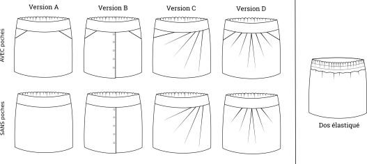 Pack de jupes courtes polymorphes, taille basse, coupe légèrement évasée, dos élastiqué smocké, large ceinture devant. 2 options de poches : avec ou sans poches italiennes.