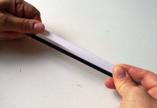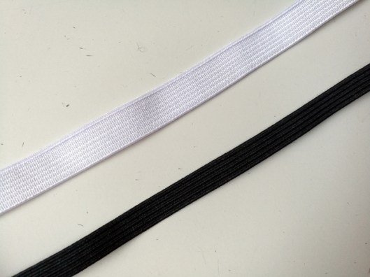 Ci-dessous : l’élastique blanc tissé ne se déforme pas (utilisé ici pour ma jupe) et l’élastique noir standard (qu’on trouve partout) qui est tressé/côtelé, plat, dur et qui rétrécie en largeur quand on l’étire : élastique que j’évite d’utiliser au maximum…