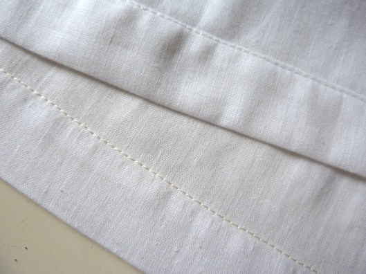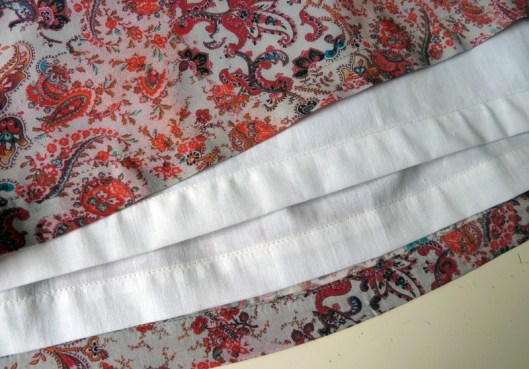En ce qui concerne l’ourlet de la jupe (tissu extérieur et doublure), j’ai opté pour un ourlet de 2 cm au lieux des 3 cm conseillés : j’ai fait un premier repli de 0,7 cm puis un second de 2 cm.