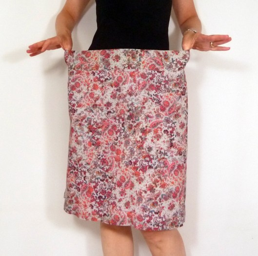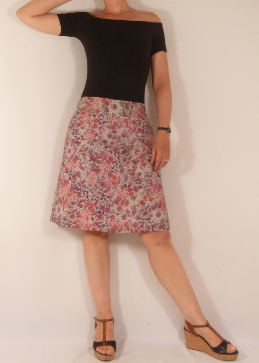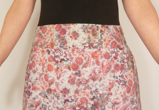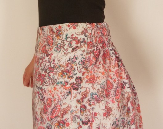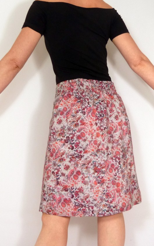 L’un des points forts de ce patron c’est qu’il s’agit d’une jupe tout confort et sans pose de zip ! Ce qui est fort pratique, j’en conviens. Cette jupe est semble-t-il adaptée à la plupart des morphologies, j’en doute un peu pour les morphologies en A car il y a bien, quoi qu’on en dise un côté gonflant au dos et plat au devant même avec un tissu fin et souple comme viscose que j’ai choisie ici.