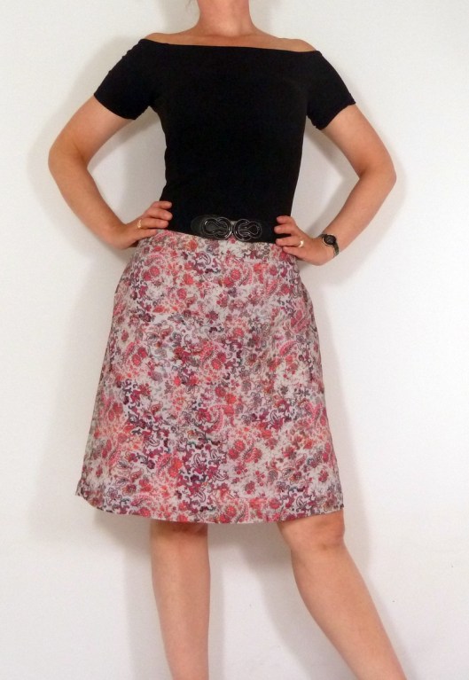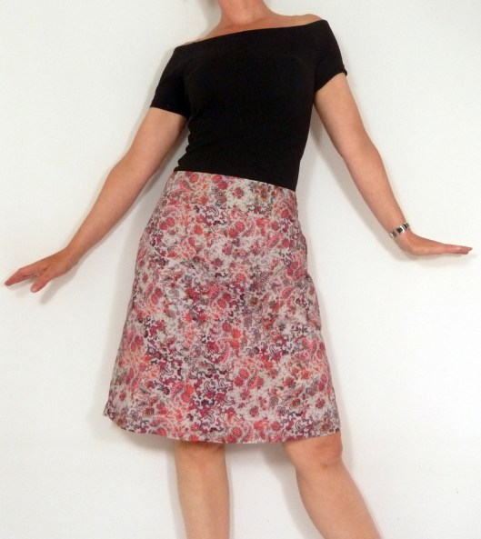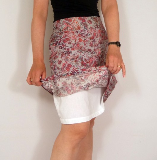 Je n’ai pas suivi les explications qu’Ivanne Soufflet propose pour coudre la doublure à la jupe. J’ai en effet trouvé que la technique d’assemblage proposée était plus compliquée et demandait plus de temps et de précision. J’ai donc préféré faire comme j’en avais l’habitude, méthode qui me semble beaucoup plus simple : j’ai cousu le devant et le dos de la jupe par les coutures latérales : tissu extérieur et tissu doublure à l’identique. J’ai ensuite inséré la doublure dans la jupe envers contre envers et fixé les deux jupes au niveau de l’ouverture du haut par un point de bâti machine. La jupe est ensuite considérée comme formant par la suite qu’une seule jupe. Et voilà !