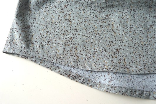 Comme conseillé, j’ai un fait un double rentré (0,6 cm puis 1 cm) pour l’ourlet mais je vous conseille de le réduire, ça facilitera la réalisation de l’ourlet dans les zones où l’ourlet est arrondi.