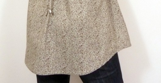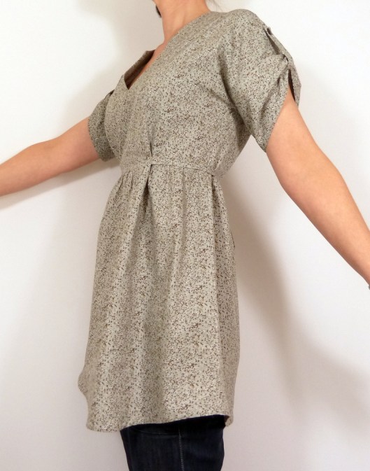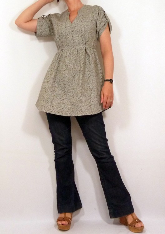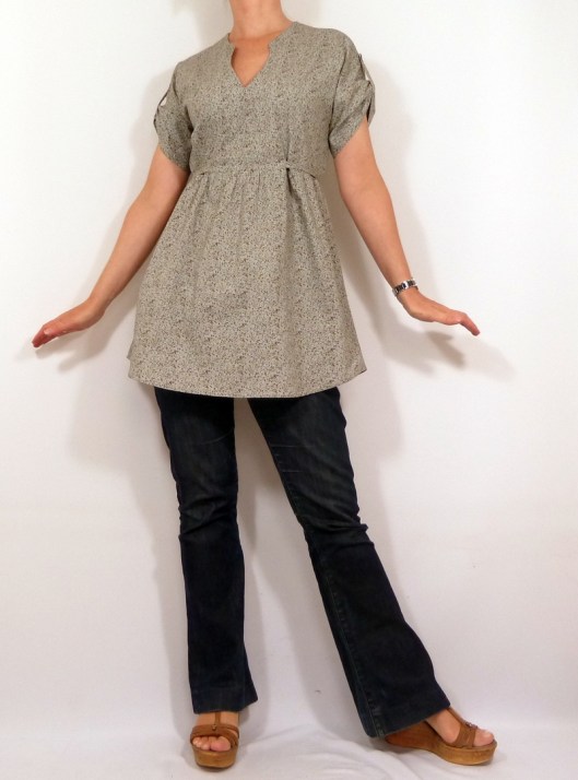 Pour cette première version, j’ai opté pour la blouse avec encolure tunisienne, manches retroussées par une patte de boutonnage et liens à nouer. La seule modification que j’ai faite, c’est que j’ai allongé la blouse de 15 cm afin d’obtenir une tunique.