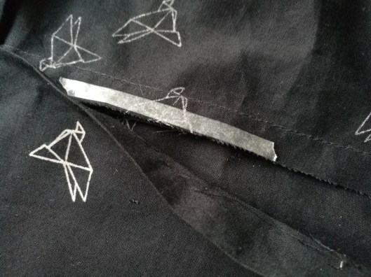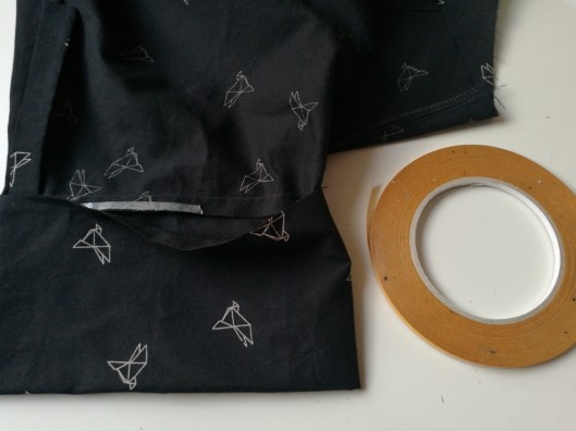 En ce qui concerne les bracelets de manche, pour avoir une surpiqûre aussi jolie sur l’endroit que sur l’envers, il faut veiller à bien positionner le repli du tissu. Pour ce faire, j’utilise évidemment des épingles mais aussi un ruban double-face (acheté chez IDM mais on en trouve aussi chez Fil 2000) étroit qui permet de préfixer le bracelet de manche. Pour éviter d’encoller l’aiguille de la machine à coudre, je dispose ce ruban au plus près du bord non fini de mon tissu :