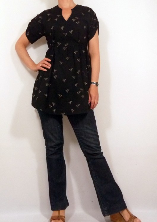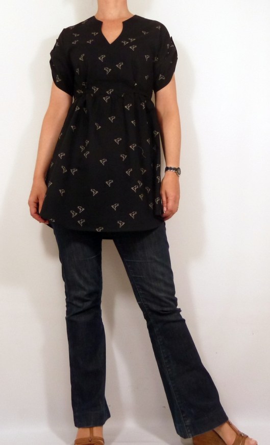 Côté modification, j’ai allongé la blouse en tunique (+ 15 cm) comme pour ma 1ère version. Par contre, j’ai mis la pièce corsage devant au pli du tissu pour éviter d’avoir une couture au milieu devant (il faut tout simplement retirer au milieu devant les 1 cm de marge de couture).