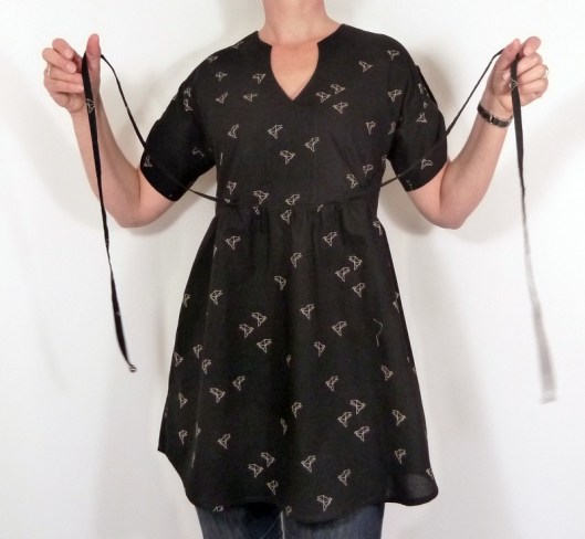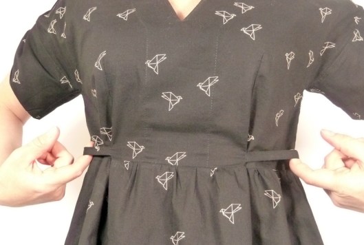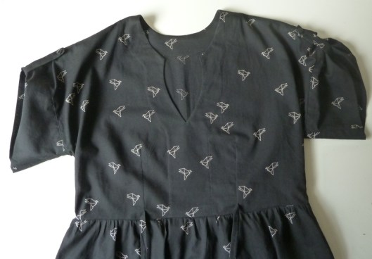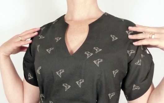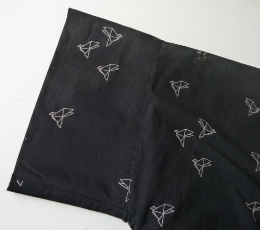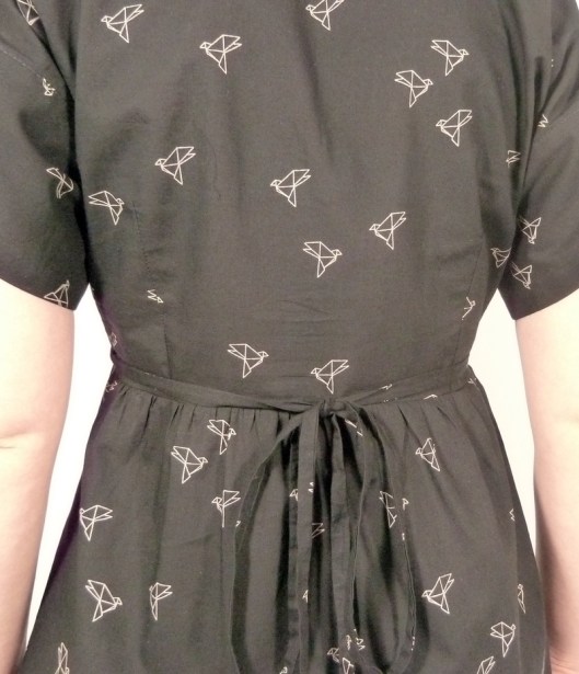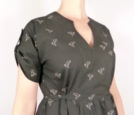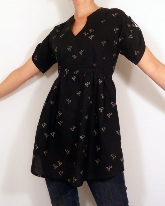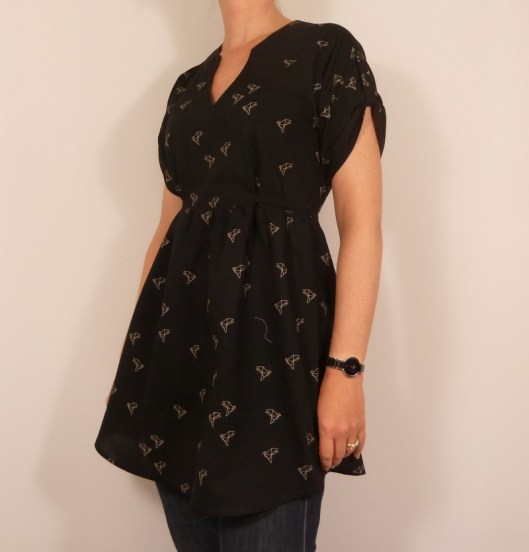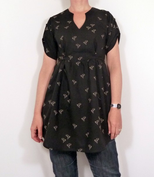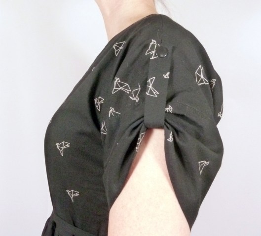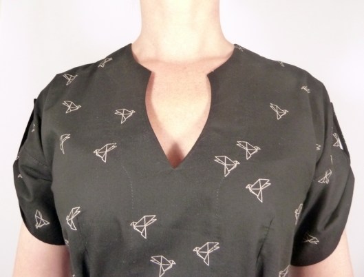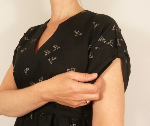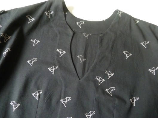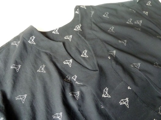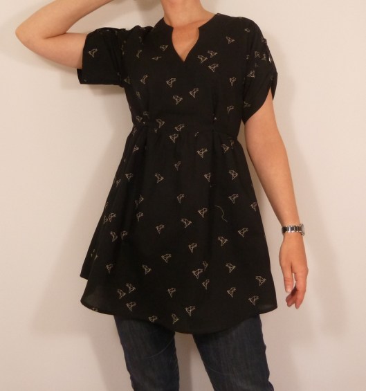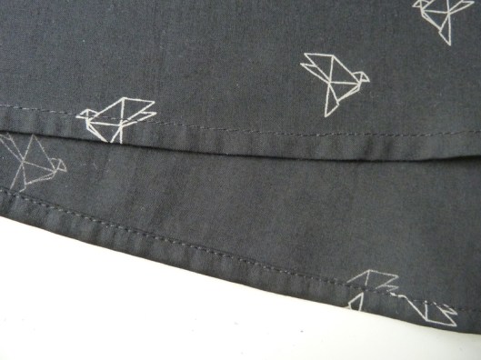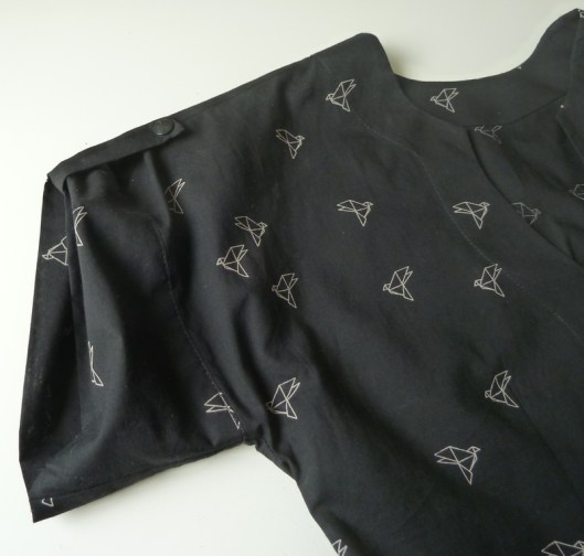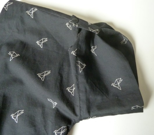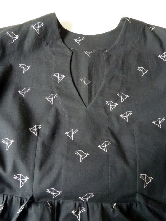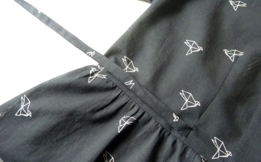 Pour cette 2ème version, j’ai choisi un tissu Atelier brunette acheté il y a quelques temps en promotion (-30%) dans la boutique Anna Ka Bazaar. Il s’agit de la batiste de coton noire « Bye Bye Birdie » dont j’aime beaucoup l’imprimé. Je suis très contente de cet achat (pas de déconvenue à signaler !).