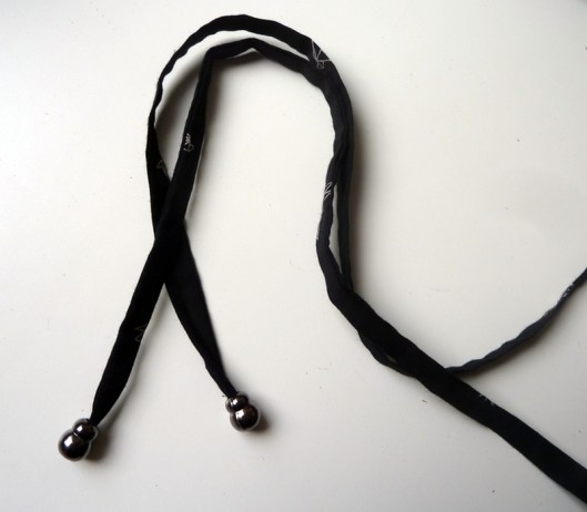 Les liens à nouer sont pris dans la couture des pinces du devant. Je les ai finis par des petits embouts trouvés chez Fil 2000.
