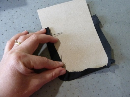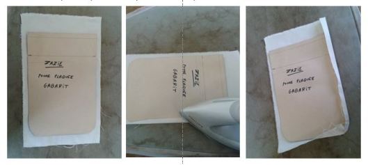 Le principe est simple : on découpe la pièce du patron dans une cartonnette en veillant à retirer les valeurs de couture. On vient ensuite placer notre gabarit sur notre pièce en tissu et on vient préformer les ourlets de la poche en plaquant les valeurs de couture sur notre gabarit. On presse bien le tout au fer en utilisant le fer vapeur en plusieurs étapes successives.