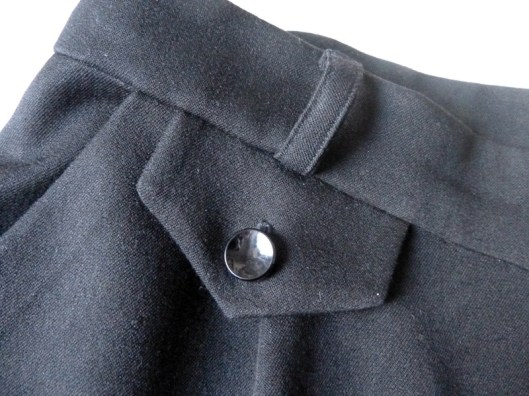 Là, je dois bien avouer que je n’ai pas compris les explications alors que ce doit être tout simple… Comme j’ai bugué sur ce détail technique, j’ai donc décidé de faire une fausse poche gousset : il n’y a donc que le rabat boutonné que j’ai cousu. Rabat que j’ai positionné au niveau de la pince et du passant, contrairement aux crans indiqués dans le patron (goût personnel).