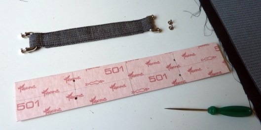 La bandoulière vient se fixer sur des attaches placées sur les côtés du sac. Comme proposé, j’ai posé 2 rivets sur ces attaches au lieu de piquer les diagonales du rectangle.