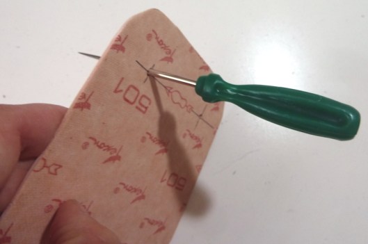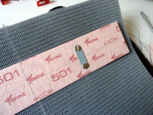Pour la doublure, j’ai choisi du coton tout simple mais trop fin/léger à mon goût. Il y a en effet des risques de frottement et donc d’usure au niveau des vis du pontet & du texon. Idem au niveau de l’attache-cartable. Pour ma part, j’ai donc préféré entoiler la doublure de ces parties.