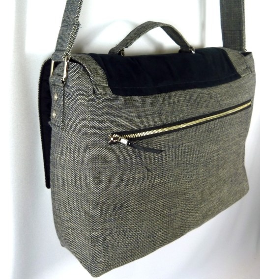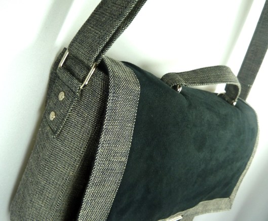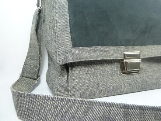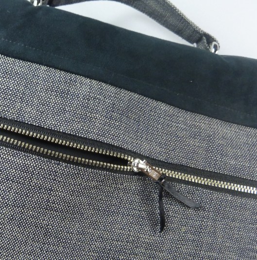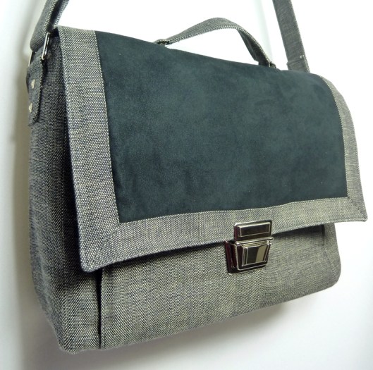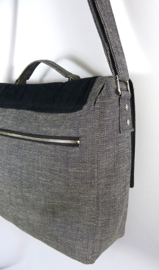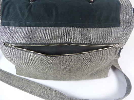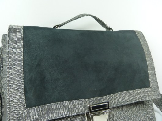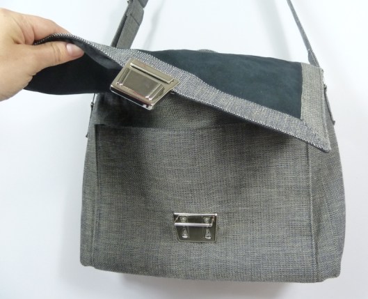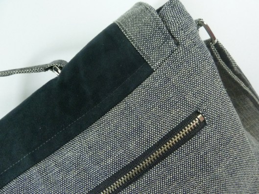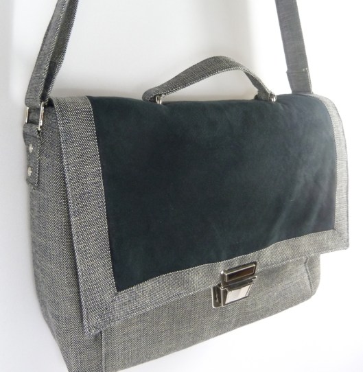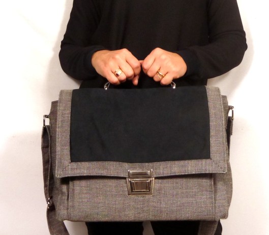 J’aime aussi bien le côté pratique et fonctionnel de ce sac que son design : à la fois sobre et élégant. Tout dépend également des tissus choisis. Le rabat est ici cousu dans deux tissus différents : suédine et lin. J’aime bien cette association.