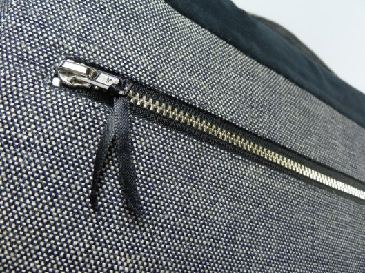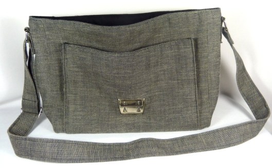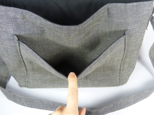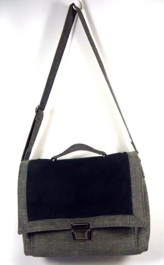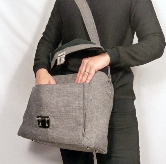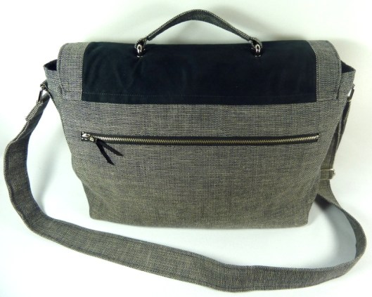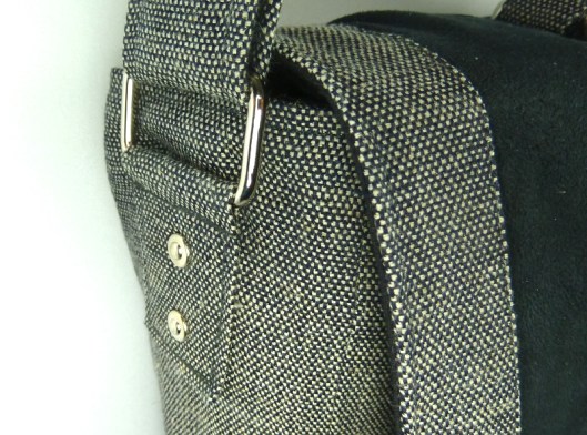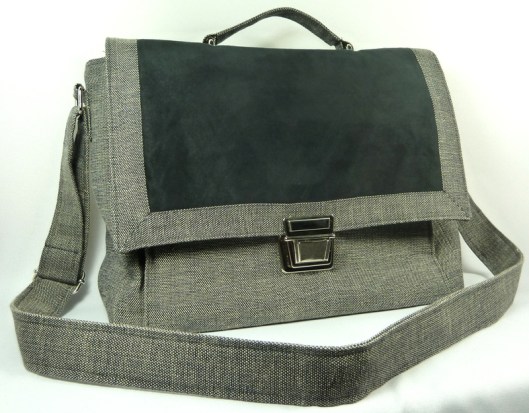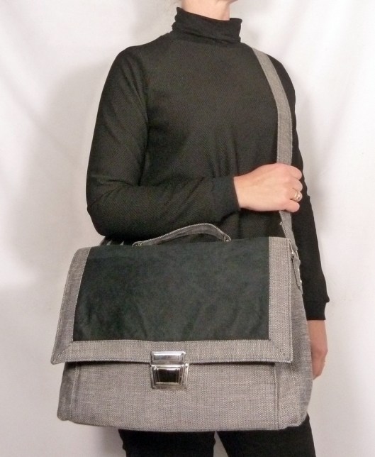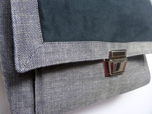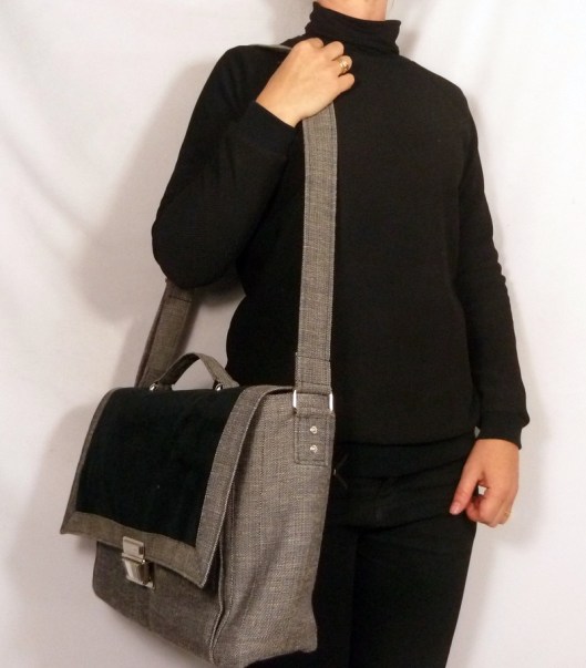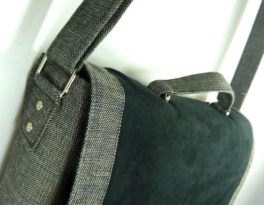 J’aime aussi bien le côté pratique et fonctionnel de ce sac que son design : à la fois sobre et élégant. Tout dépend également des tissus choisis. Le rabat est ici cousu dans deux tissus différents : suédine et lin. J’aime bien cette association.