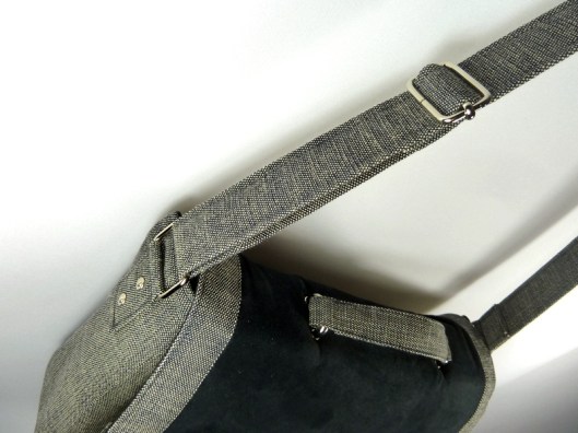 On peut aussi porter ce sac en bandoulière. Ici la bandoulière est ajustable :