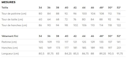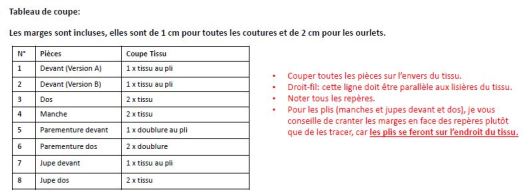 Côté tailles, ce patron est proposé de la taille 34 à 46 (pochette) et de la taille 34 à 52 (PDF). Au regard du tableau des mesures et de l’aisance apportée au modèle, je n’ai tenu compte que de mon tour de poitrine et de mon tour de taille et j’ai donc coupé intégralement la taille 36.