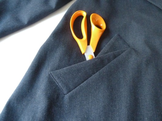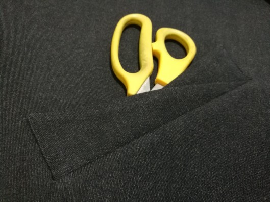Les instructions sont suffisamment claires pour moi mais en même temps, ce ne sont pas les premières que je réalise, je connais donc la procédure. Ces poches m’ont tout de même donné quelques sueurs car ça demande quoiqu’on en dise de la minutie et de la précision. Je n’ose imaginer celles qui ont cousu ces poches avec un lainage épais, oh my god ! Il y a tout de même une sacré épaisseur à gérer avec ces deux passepoils superposés ! Je vous conseille vivement d’utiliser un entoilage thermocollant fin pour votre passepoil, histoire de limiter les épaisseurs. La réalisation de cette poche passepoilée demandant une certaine dextérité, je vous conseille également d’éviter d’utiliser pour le dos de votre passepoil et pour votre fond de poche un tissu qui contraste trop… Donc, ne faites pas comme moi et utilisez du ton sur ton !