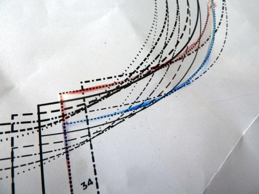 Faites attention quand vous décalquez votre doublure car ça demande un peu de concentration ! Les lignes tissu extérieur et doublure se superposent puis se dissocient et on ne sait plus très bien qui est quoi… Les lignes qui concernent la doublure = lignes en gras.