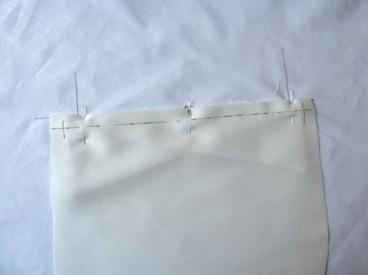 Quand on positionne le fond de poche sur les passepoils, je marque un repère à 1 cm de chaque côté. Les passepoils ne doivent pas dépasser ces repères.