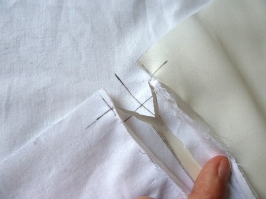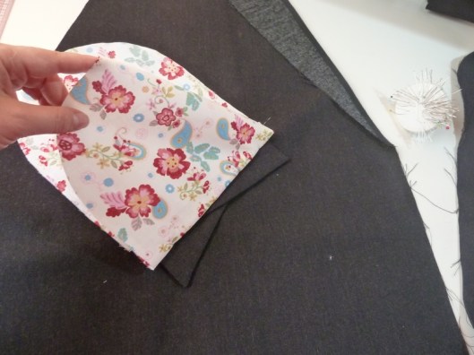 Ces poches, moi je les connais sous le nom de poches raglans. J’ai appris la technique grâce à la Mairie de Paris et à la méthode ESMOD. Normalement il faut laisser les angles en capucin sur l’endroit du vêtement. Curieusement, Deer and Doe ne le fait pas et demande de cacher les capucins sur l’envers (comme ci-dessous), ce qui est gênant je trouve.