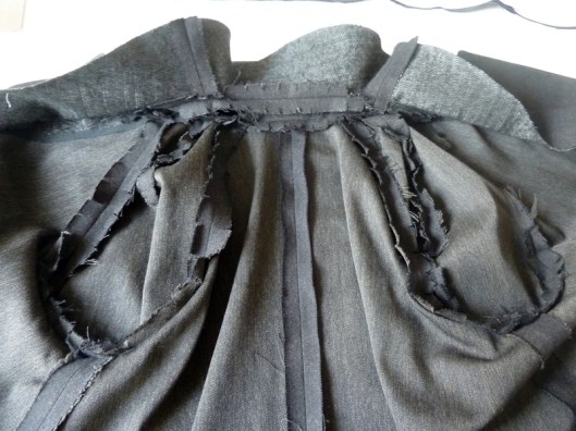 Voici une vue de l’intérieur du manteau (avant glaçage du col) et toutes les valeurs de couture crantées :