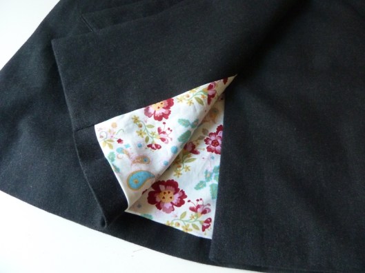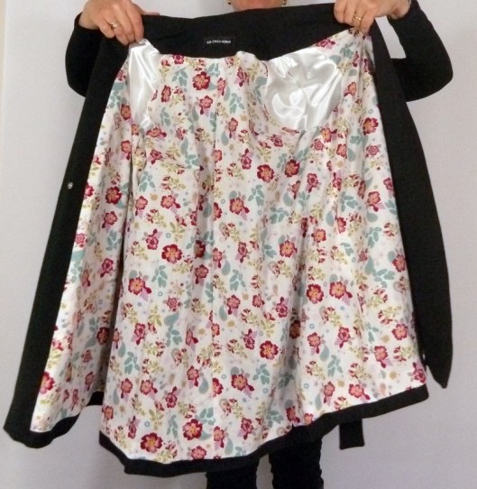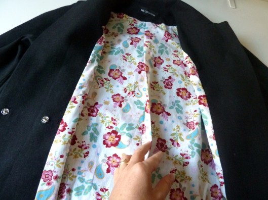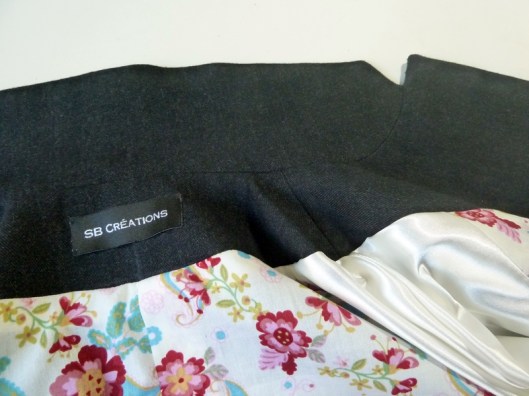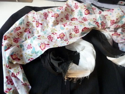 Pour la doublure, j’ai opté pour une cotonnade fleuri de mon stock pour le corps de la doublure et les chutes de tissu de ma robe de mariée dont je ne savais que faire (7 ans après il était temps !) pour les manches. Du coup j’ai des manches en satin de soie, trop la classe !