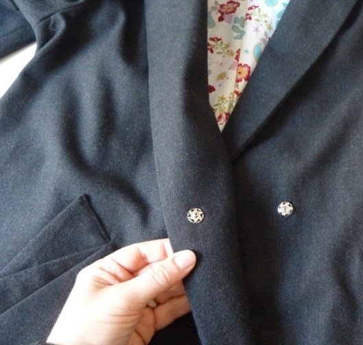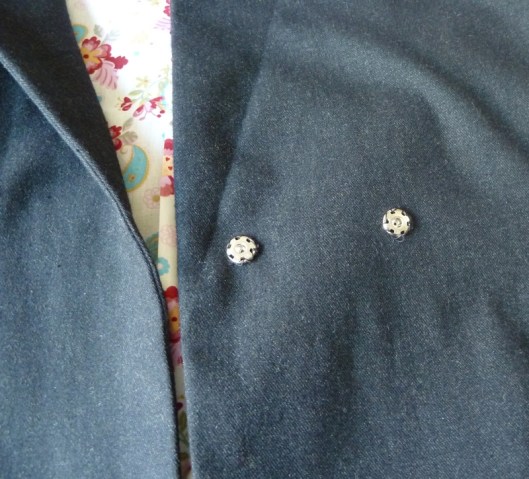 Le manteau est fermé au devant par des pressions cousues à la main (je préfère qu’elles soient discrètes, elles mesurent donc 1,5 cm) :