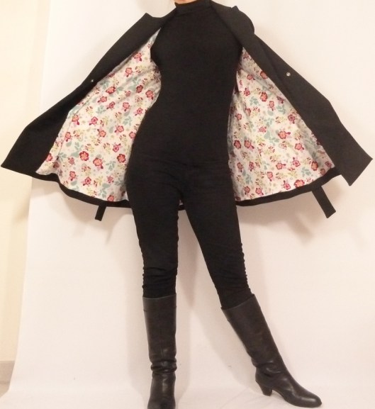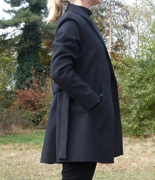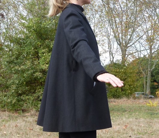 A mon avis, il aurait été souhaitable de prévoir des parements pour les ourlets du bas du manteau (toujours à la manière de République du chiffon – veste Michelle) car le bas est relativement arrondi et le tissu gondole donc un peu au niveau de l’ourlet… d’ailleurs ça se voit bien sur la photo ci-dessous :