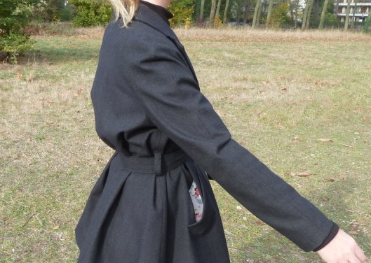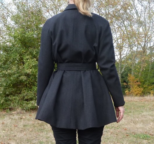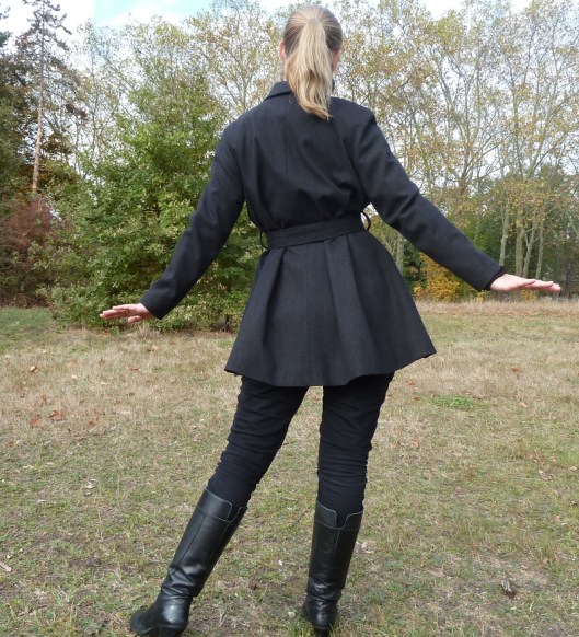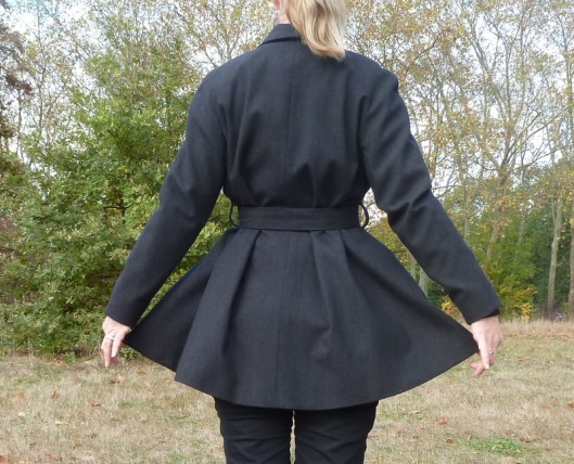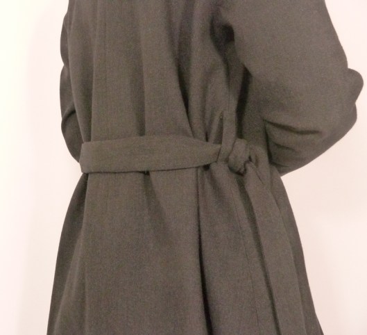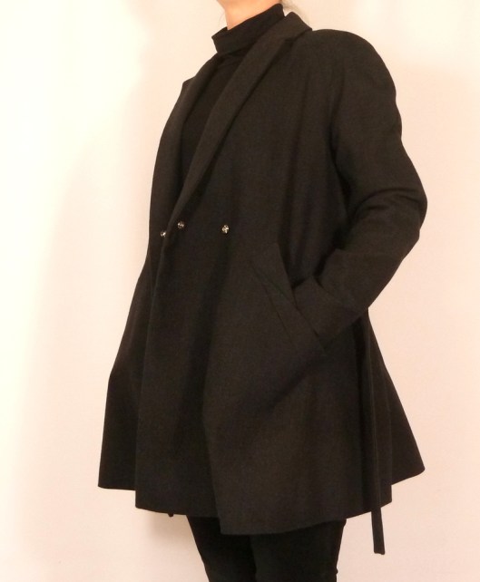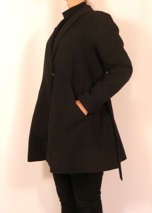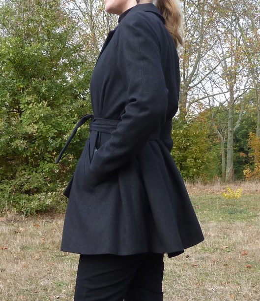 2/ Manteau fermé avec ceinture : je trouve que la ceinture fait des plis dans le dos et je ne trouve pas ça esthétique. Pour que ça le soit, il faudrait que les plis soient disposer de façon harmonieuse. Ici, je ne m’en suis pas soucié et donc ça se voit. De face ça passe mais de profil et de dos je trouve que ça fait bizarre, il y a un surplus de tissus qui me gêne vraiment…
