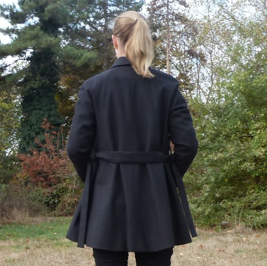 3/ Manteau avec pressions et demi-ceinture : C’est pour moi le bon compromis ! La version qui me plait le mieux est donc celle où je porte le manteau avec les boutons pressions et la ceinture mais que je ne noue pas au devant : la ceinture placée ainsi permet de résorber un peu l’ampleur au niveau du dos.