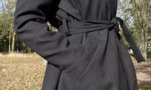 Quand on noue la ceinture au devant, ça ouvre les poches, ça leur donne du volume (du 3D !) et je n’aime pas trop. On ne s’en rend pas bien compte sur les photos mais c’est une réalité. En fait, il ne faut pas trop serrer la ceinture comme ici…