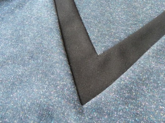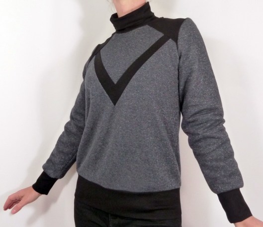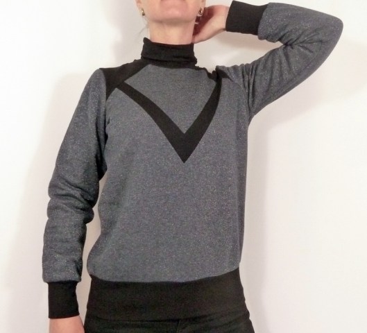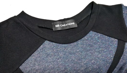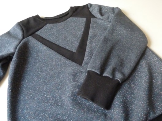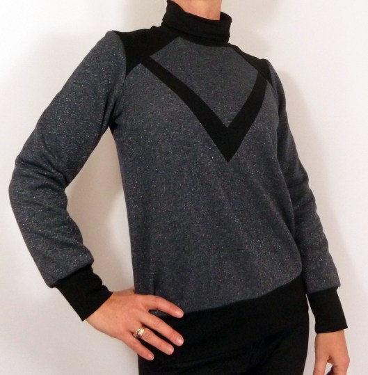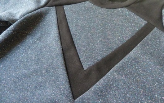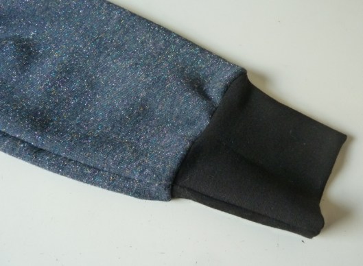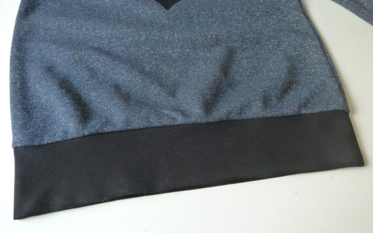 Je le trouve très joli ce jersey légèrement pailleté (90% coton et 10% lurex). L’inconvénient de ce tissu, par contre, c’est qu’il peluche énormément sur l’envers qui est duveteux… Du coup, si je porte du noir en dessous, j’ai plein de résidu et je n’aime pas ça ! Ca s’est un peu atténué au lavage mais ce n’est pas encore ça…