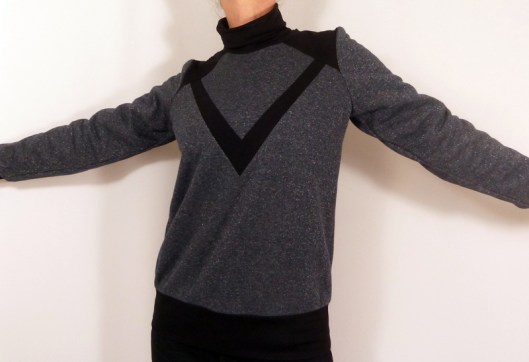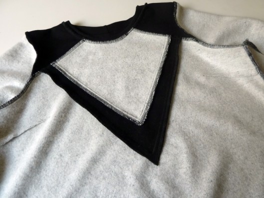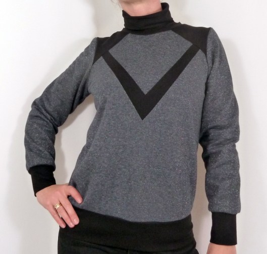 Revenons au sweat ! A n’en pas douter la difficulté technique du patron est le devant avec les empiècements incrustés. Comme pour la blouse, je les ai cousues à la machine à coudre puis j’ai surjeté dans un second temps les bords. La technique pour coudre un bel angle est ici.