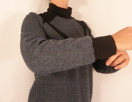 A l’essayage, j’ai trouvé les manches bien trop larges, je les ai donc décousues puis réduites de 10 cm. J’ai également adapté les dimensions des poignets pour que ça me conviennent totalement.