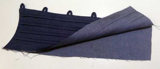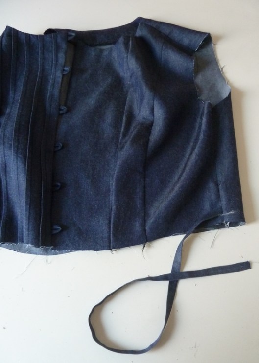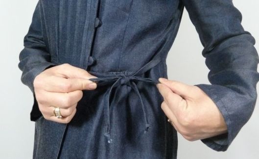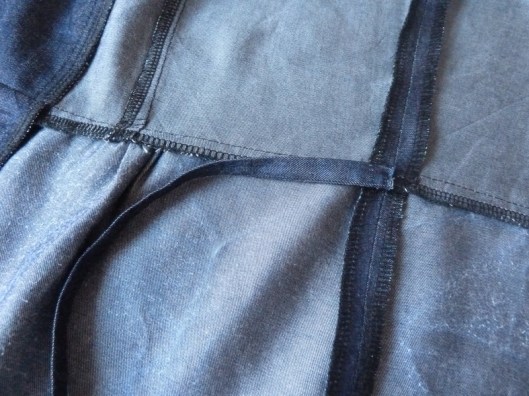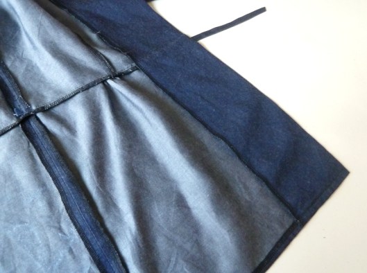Pour les liens à nouer, j’ai fixé le premier dans la couture des côtés du devant gauche à 1 cm du bord :