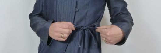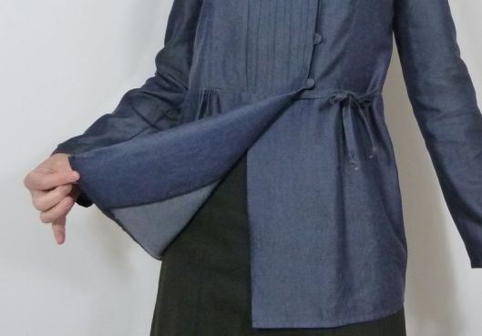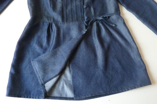 Pour le second lien, il est à fixer une fois la blouse finie et on le coud à la main. Moi je l’ai cousu sur les valeurs de couture au niveau de la couture des côtés (devant droit) :