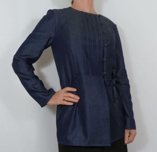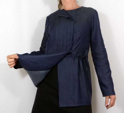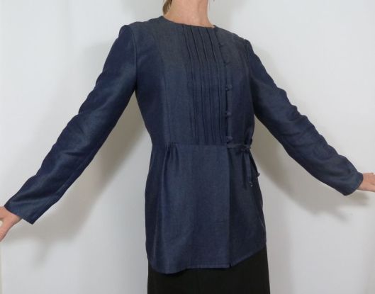 Voici les photos présentées par Burda : un chemisier asymétrique à encolure ronde et manches longues, avec basques, plastron à plis nervures fermé au devant par des brides et petits boutons. La blouse est légèrement cintrée à la taille et fermée par un petit lien à nouer.