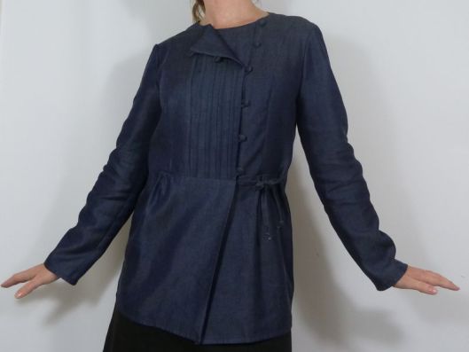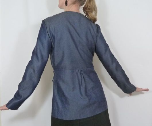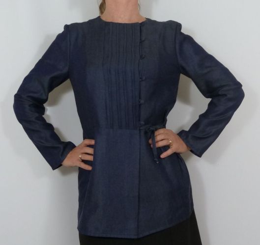J,aime beaucoup ce modèle et justement ce petit côté strict !! En blanc, je pense qu’elle serait parfaite, en faisant quelques adaptations effectivement. Je trouve moi aussi qu’elle pourrait être un peu plus cintrée, que la basque pourrait être coupée un peu plus en trapèze pour éviter que le pan gauche ne se referme pas complètement. J’affinerais et je raccourcirais un peu les manches. Et je pense que je creuserais un peu l’encolure qui monte un peu haut à mon goût.