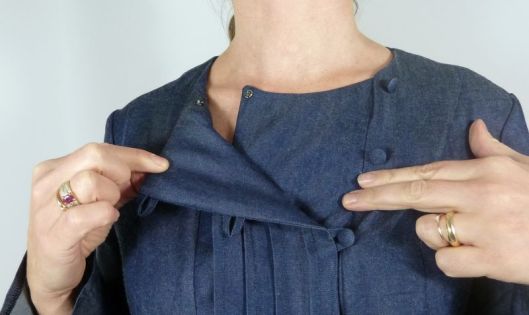 Les boutons, qu’on pose en toute fin, sont positionnés sur le devant gauche. L’emplacement des boutons n’apparait pas dans le patron (et je le regrette), c’est à nous de les marquer. Cela dépend en effet de la dimension des boutons choisis.
