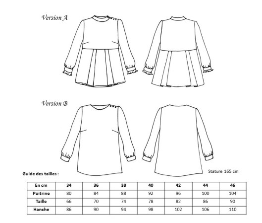 Le patron est proposé de la taille 34 à 46. Vu l’ampleur du modèle au niveau des basques, j’ai choisi de coudre intégralement cette blouse en taille 36 (mesure qui correspondait à mon tour de poitrine). Il n’y a pas de tableau des mesures finies du vêtement, ce qui ne permet pas de se rendre compte de l’aisance apportée au modèle : Attention donc car la coupe est très ajustée au niveau du haut du corsage et ample au niveau du bas. A l’essayage, je me suis rendue compte que ça tiraillait un peu au niveau de la carrure et que c’était un peu juste en matière de longueur d’épaule.