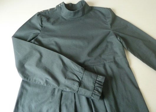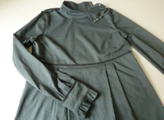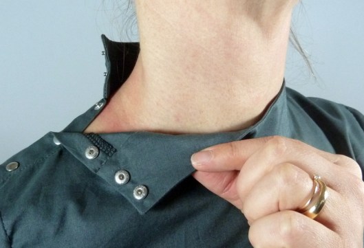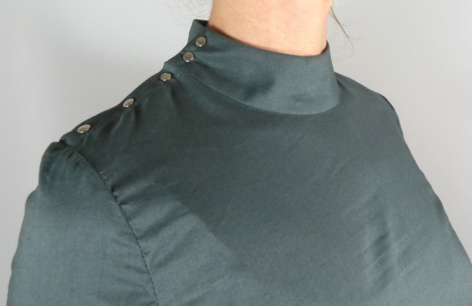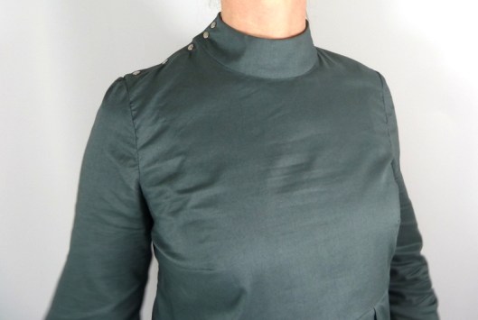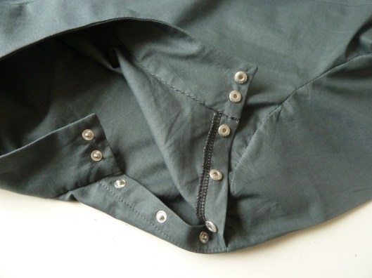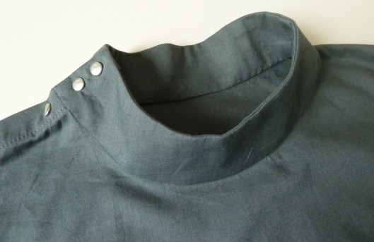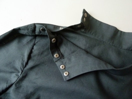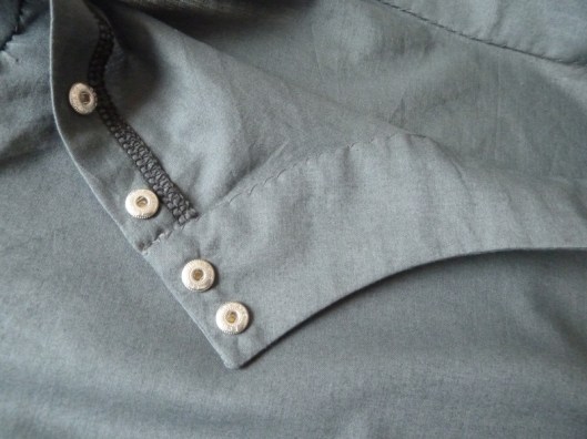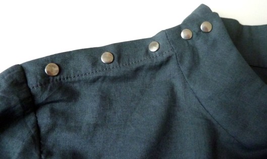 J’ai opté pour des petits boutons pressions en métal Prym pour fermer la blouse. Je trouvais que ça s’associait bien avec ce tissu kaki et puis c’est plus rapide à fixer que de faire des boutonnières. Attention, l’emplacement précis des boutons et des boutonnières ne figurent pas dans le patron, c’est à nous de le déterminer.