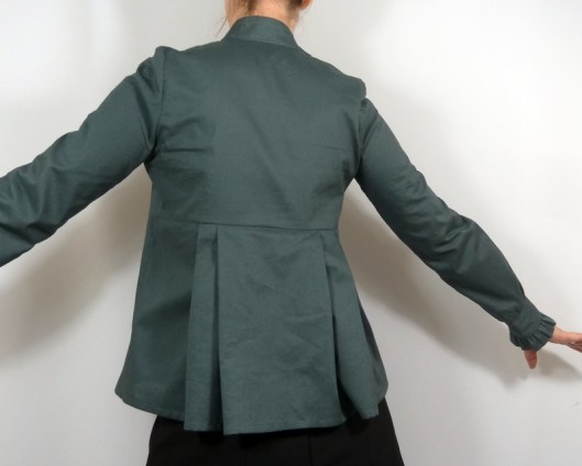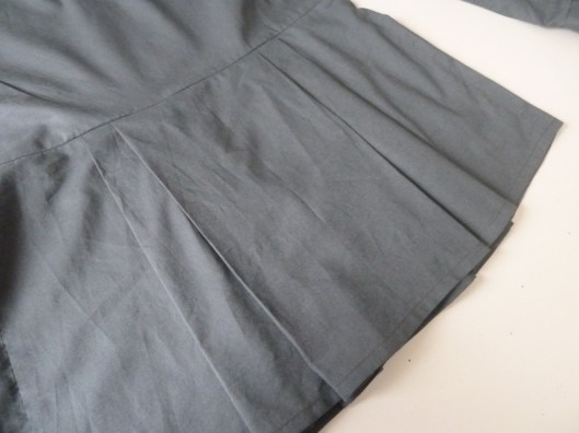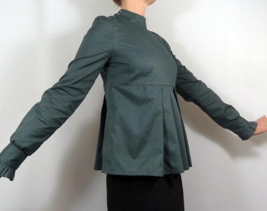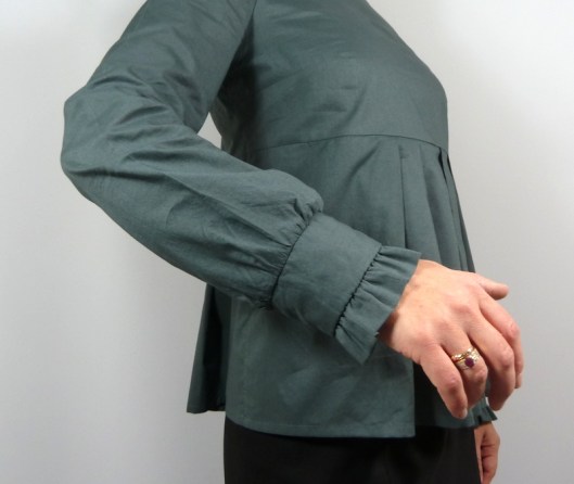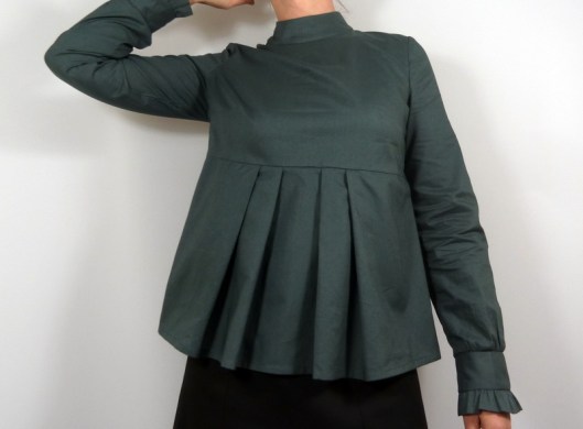 J’ai été séduite par plusieurs détails de cette blouse : le col droit et sa patte de boutonnage à l’épaule, ses basques devant et dos à plis et ses manches longues finies par un petit volant.