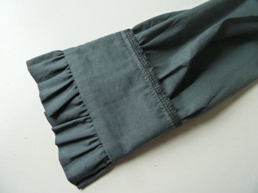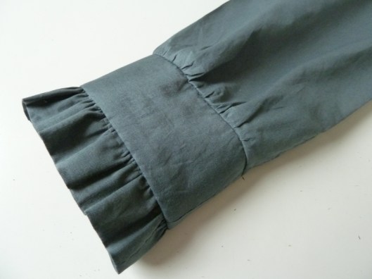Dans les explications, il est indiqué que « les poignets doivent avoir de la tenue, ne pas hésiter à les doubler/thermocoller si nécessaire. » Pour ma part, pour éviter que l’entoilage thermocollant du poignet soit visible et contre ma peau, j’ai doublé les poignets. J’ai également préféré doubler le volant pour une plus jolie finition. Le fait d’avoir doublé tous ces éléments, permet également de ne pas voir toutes les coutures d’assemblage, je trouve ça beaucoup plus esthétique.