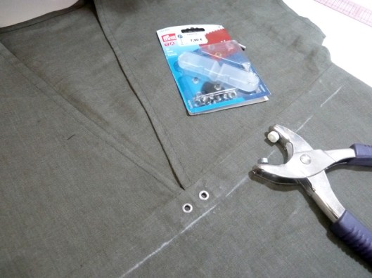 Burda propose de coudre des boutonnières, j’ai préféré fixé des œillets :