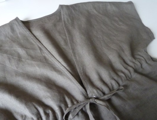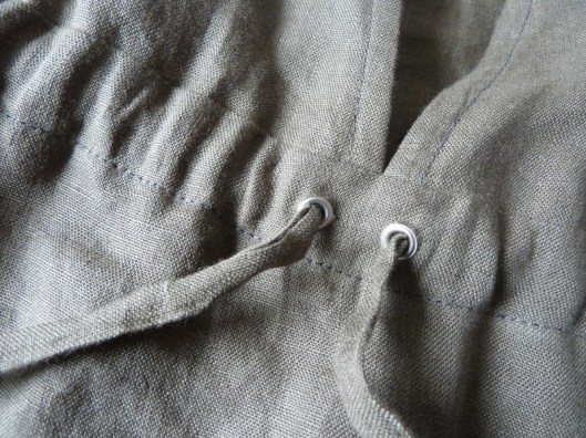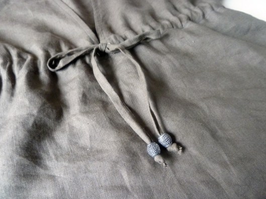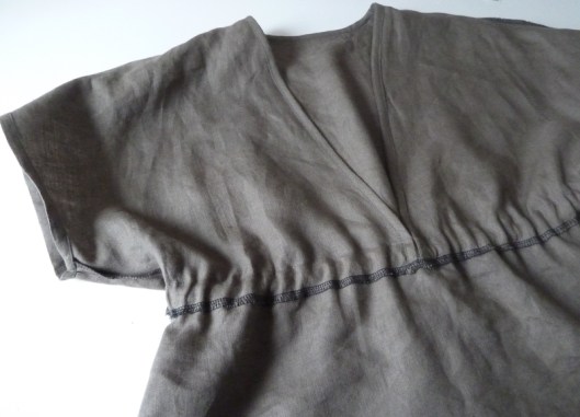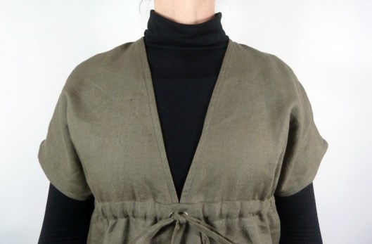 Côté explications, elles sont, vous vous en doutez, peu explicites. Le niveau annoncé est 1,5/4 : « facile à coudre, avec détails simples ». Pour ma première réalisation, j’avais omis de lire les explications et je n’avais donc pas cousu la coulisse et le lien à nouer comme préconisé… Pour ma 2ème version, j’ai donc lu attentivement les instructions et ajouté les bonnes valeurs de couture pour la création de la coulisse, à savoir des valeurs de couture de 2,5 cm au niveau des des découpes horizontales. Cette marge permet en effet de former la coulisse et d’y glisser par la suite un lien à nouer.