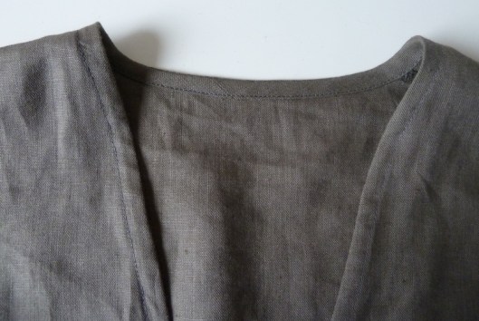 Côté finitions, j’ai posé un biais rapporté au niveau de l’encolure devant et dos. Dans les explications, il es indiqué de ne poser un biais que pour l’encolure dos, l’encolure devant étant simplement finie par double rempli.