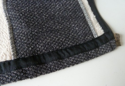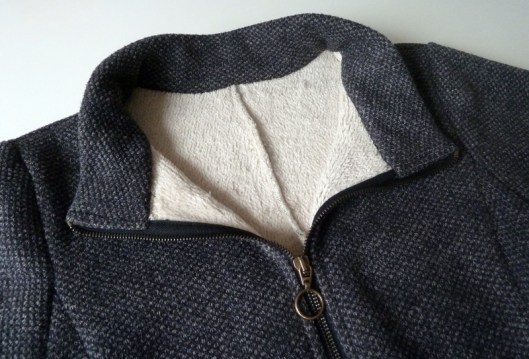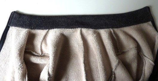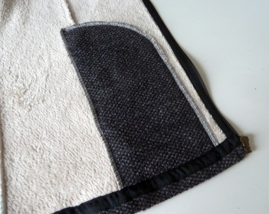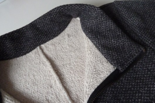 Au regard de l’épaisseur de mon tissu, je n’ai pas cousu les parementures prévues dans le patron. Sur l’intérieur, le ruban noir du zip est donc apparent mais ça ne me gêne pas plus que ça.